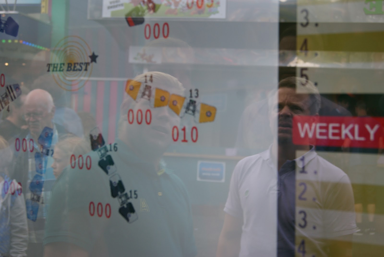 Les stands de loterie attirent à qui mieux mieux les visiteurs à grand renfort de micros pour gagner des tablettes de chocolat géantes!