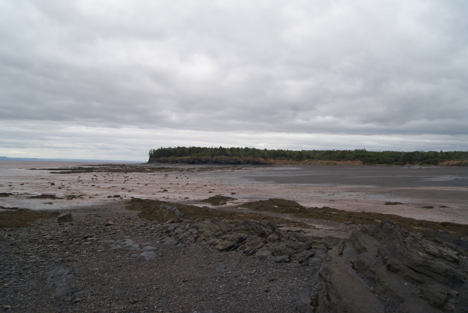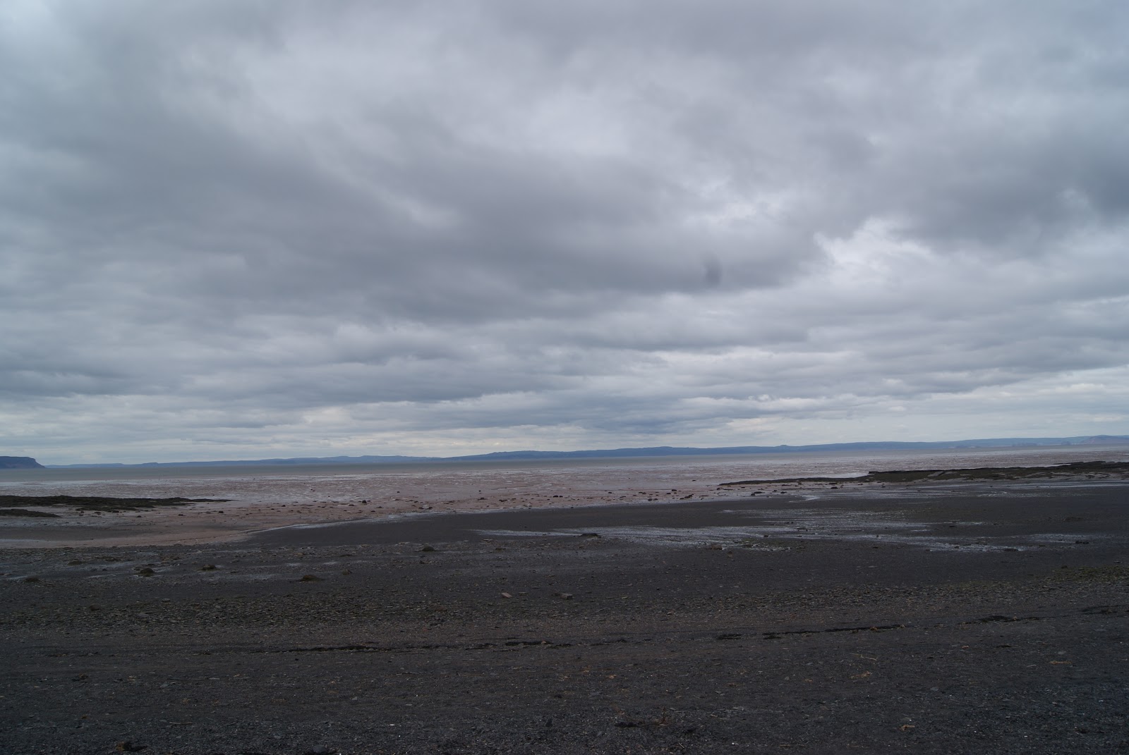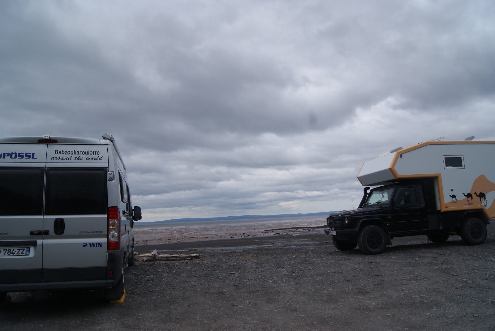Nous empruntons les magnifiques autoroutes canadiennes bordées de forêts et de lacs et nous nous arrêtons pour la nuit au bout de la baie de Fundy sous un ciel un peu menaçant.