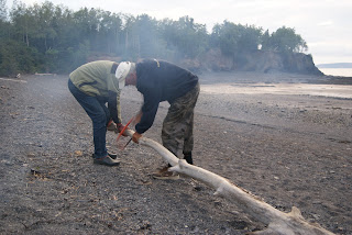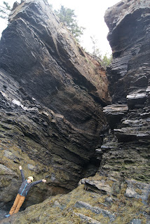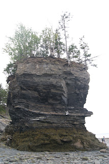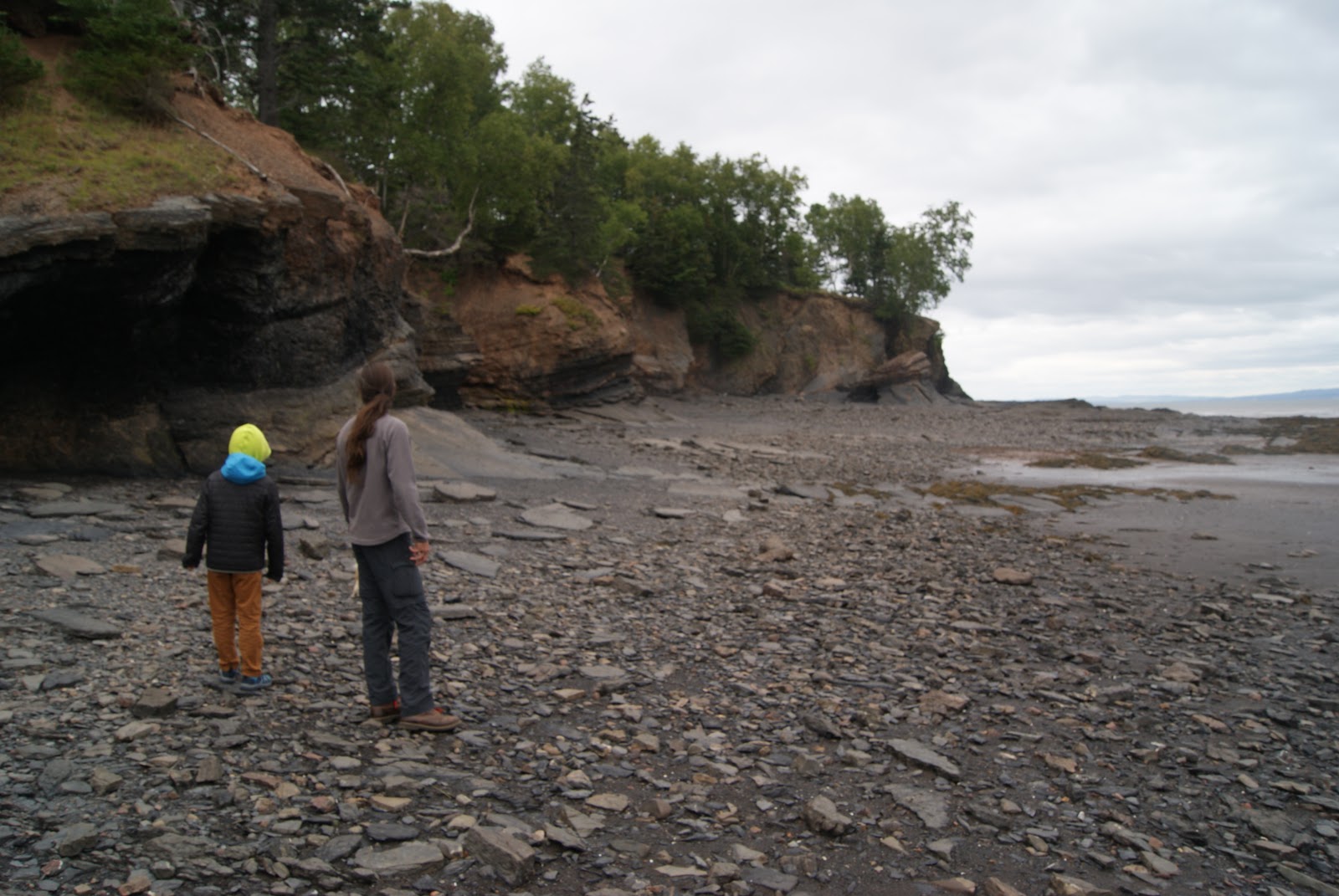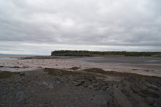 Nous avons compris un peu plus tard à quoi sert cette fameuse corde avec laquelle nous nous sommes amusés à grimper au sommet de la falaise. Pour le coup, nous nous trouvons bien à l'endroit où sont les plus grandes marées du monde. Alors que nous nous sommes baladés en ne voyant la mer que très très loin. Nous nous sommes réveillés sans cesse pendant la nuit suivante, l'eau n'était alors plus qu'à quelques mètres du fourgon, et nous avons pu nous rendormir une fois certains que la mer était en train de redescendre. L'écrire est peu de choses, le voir est complètement hallucinant. Et donc cette fameuse corde sert aux personnes qui se sont laissées prendre par la marée pour remonter à l'abri des dangers.