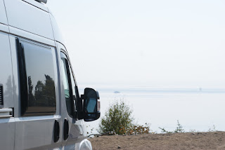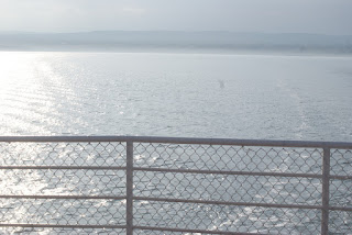 Un Canadien qui nous avait repéré dans la file d'attente pour embarquer est venu discuter avec nous sitôt le départ du bateau. Il possède lui aussi un fourgon aménagé et a le projet inverse au notre, le faire traverser par cargo pour faire un tour d'Europe. C'est la première fois que nous croisons quelqu'un qui prévoit de faire traverser son véhicule dans l'autre sens.