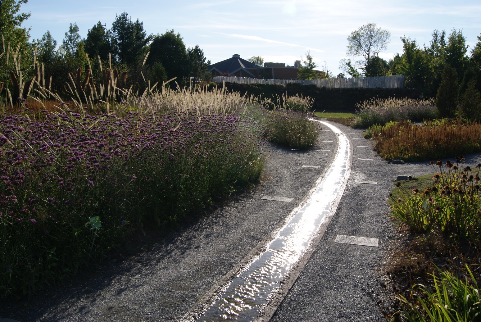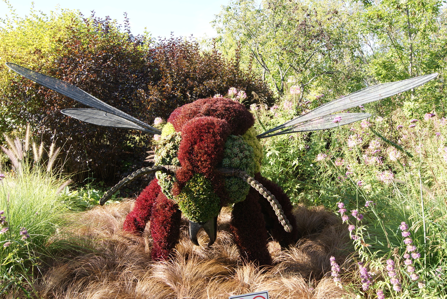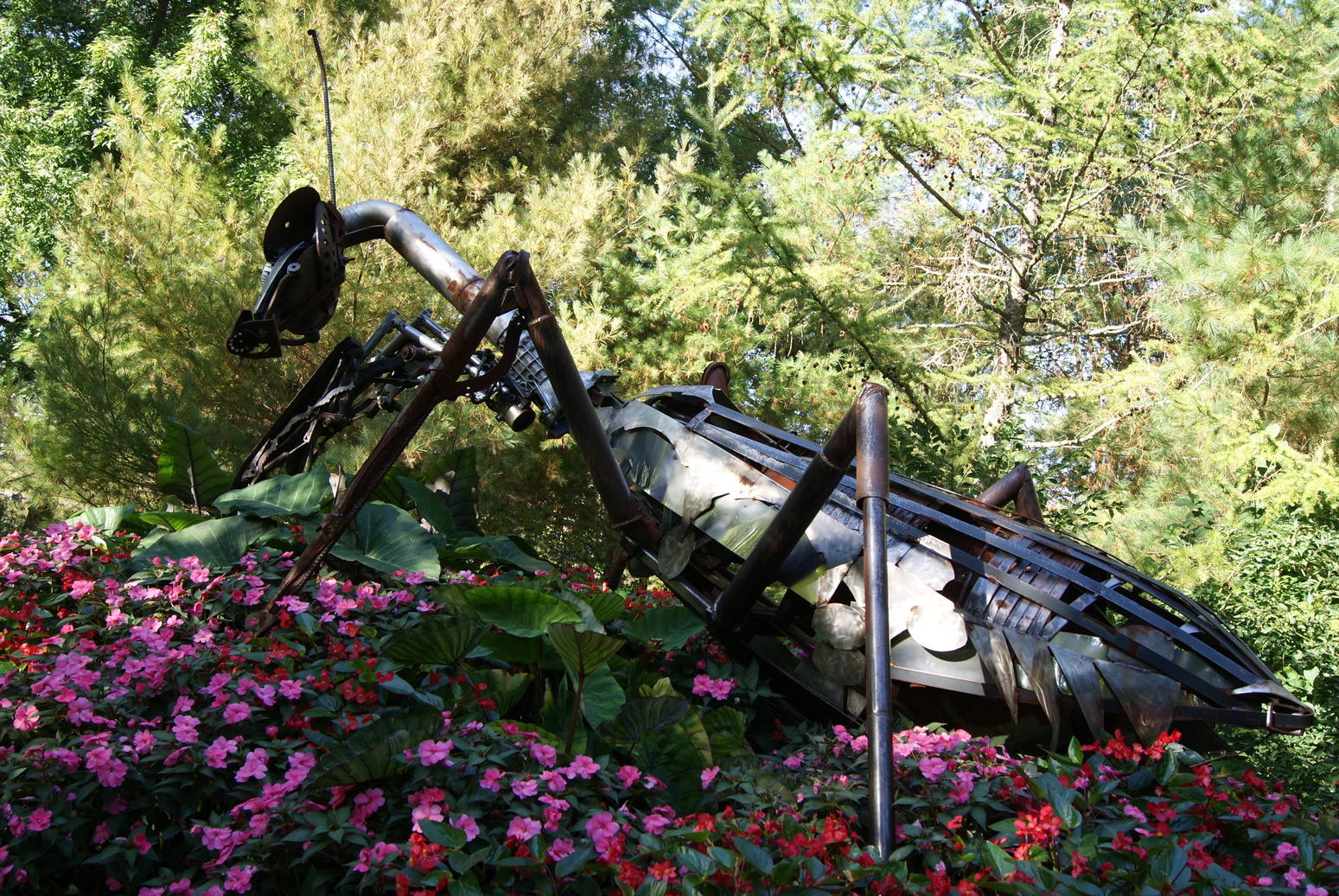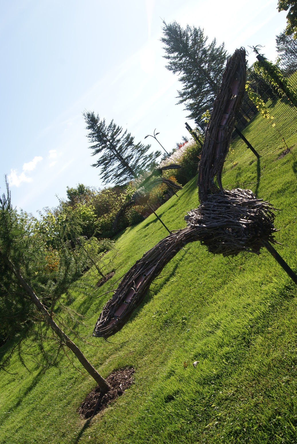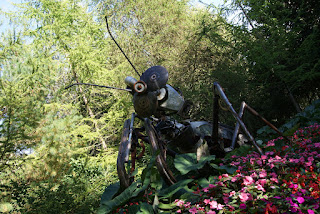 Le jardin des milieux humides: tout autour de l’étang, véritable bassin filtrant naturel, la faune et la flore s’articulent autour de ce milieu particulier. Végétaux de rivages, collections d’hémérocalles, de primevères et de papyrus ou grands saules protecteurs. C’est souvent dans les milieux humides que nous retrouvons des populations d’insectes. Nous y avons trouvé des sculptures géantes d’insectes faites de métaux recyclés. C’est aussi l’habitat de la tortue serpentine, que l’on aperçoit régulièrement pondre dans les plates-bandes!
