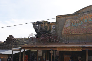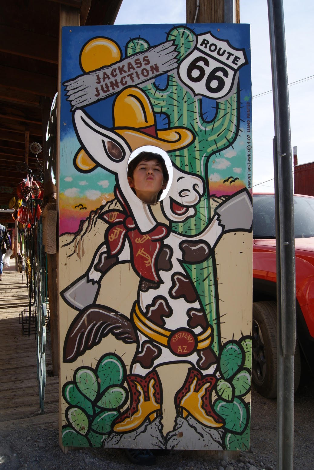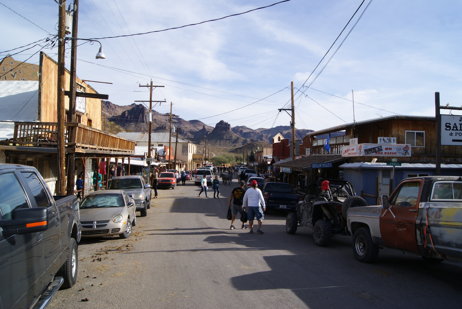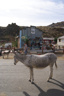 Le village d'Oatman au bord de la route 66 en pleine montagne. Il s'agit d'une ancienne ville minière. La population était montée à plus de 3 500 habitants après que deux prospecteurs ont trouvé de l'or en 1915. C'est devenu par la suite une ville fantôme, et dans les années 1960 elle a été pratiquement abandonnée.