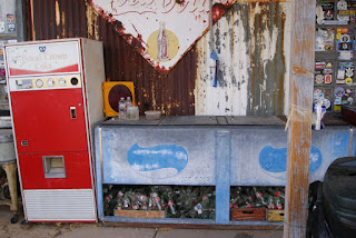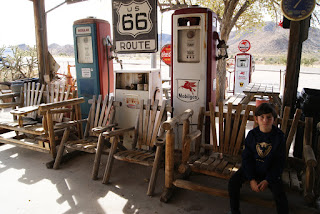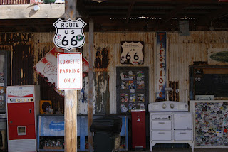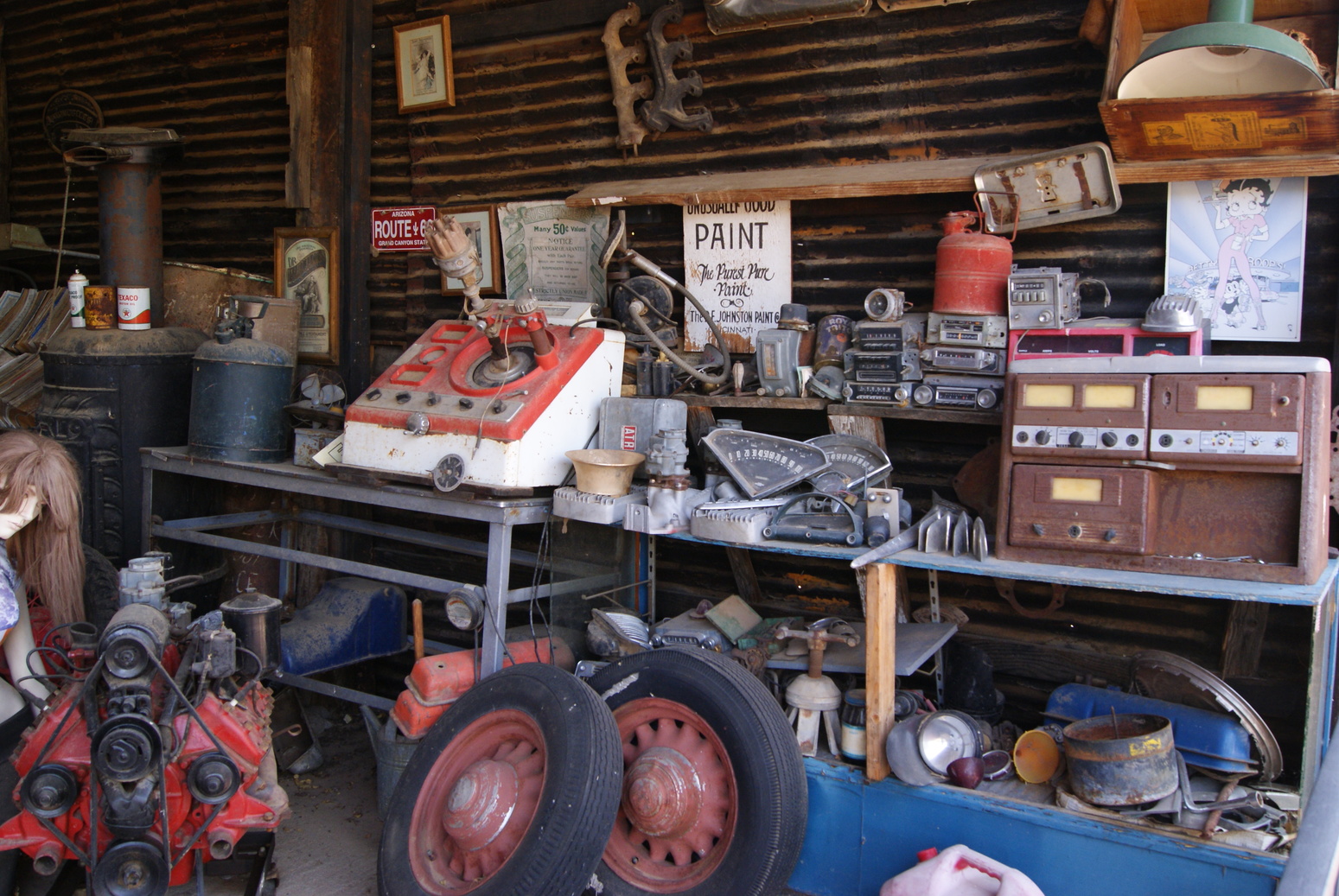 Nous sommes tombés dans la caverne d'ali baba de la 66, tout était là, une grande partie dans son jus. Une vieille dame à son comptoir pour encaisser les quelques dollars de tous les gens qui s'arrêtent pour prendre un coca ou acheter un autocollant par-ci, un souvenir d'un autre temps par-là.