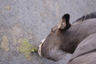 C'est bien ça, tout le village est investi par des centaines d'ânes qui déambulent au milieu des gens, viennent se chatouiller contre nous, entrent dans les boutiques...sont de partout. Nous sommes là à la période où il y a tous les bébés. Ils ont tous un autocollant sur le front pour demander aux touristes de ne pas les nourrir alors que c'est non pas autorisé mais presque obligatoire pour les adultes. Les stands de vente de nourriture pour eux ont eux aussi investi la place. La voilà la grosse manne pour les touristes! la seule et unique rue du village est devenue boutiques de souvenirs qui se succèdent les unes aux autres. Tout ce qui est à l'intérieur est désuet, d'un autre temps. C'est surréaliste mais bien drôle de se retrouver parachutés ici.