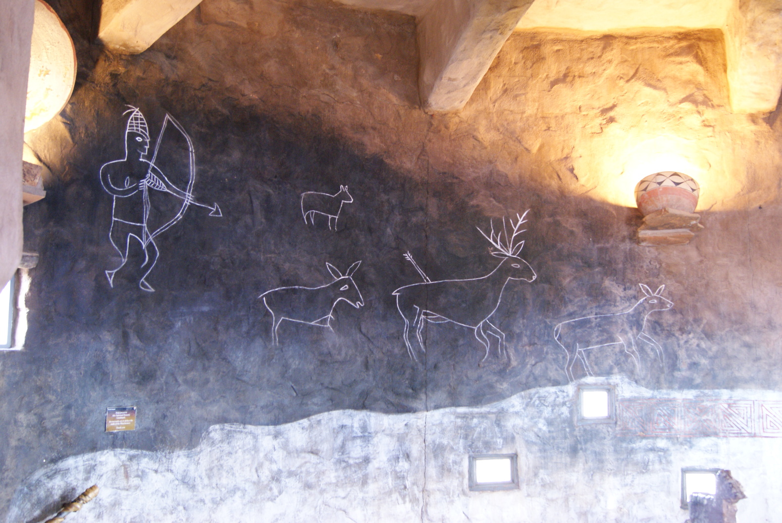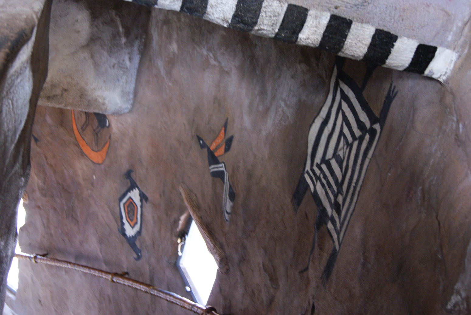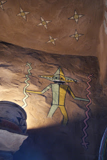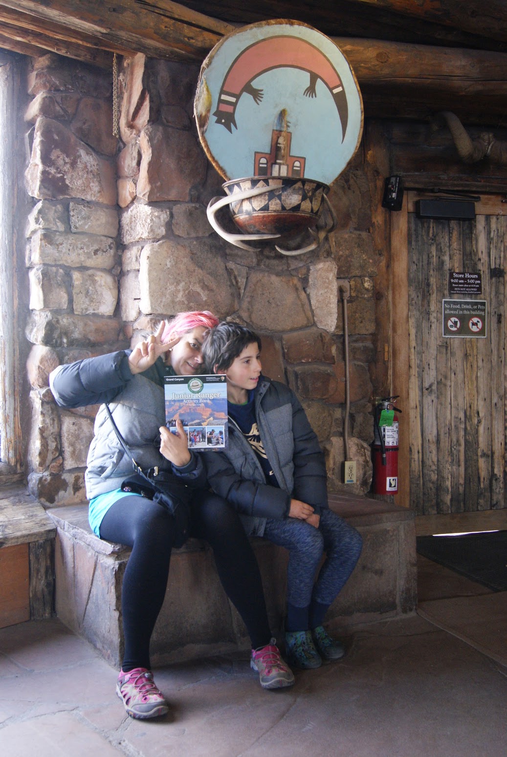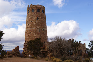 Nous faisons une petite halte à Desert view watchtower, où nous pouvons grimper au sommet de la tour d'observation. Construite en 1932, au bord du vide sur le modèle des kivas indiennes, qui sont des chambres cérémonielles sacrées, cette tour d'observation offre une vue sublime sur le Grand Canyon. C'est aussi le point le plus haut de South Rim. Tout l'intérieur de la tour est orné par des peintures de l'artiste Fred Hopi Kabotie, indien Hopi.