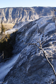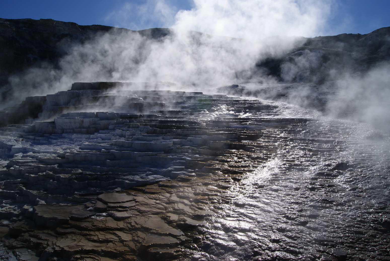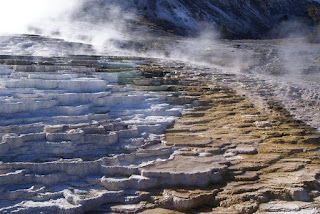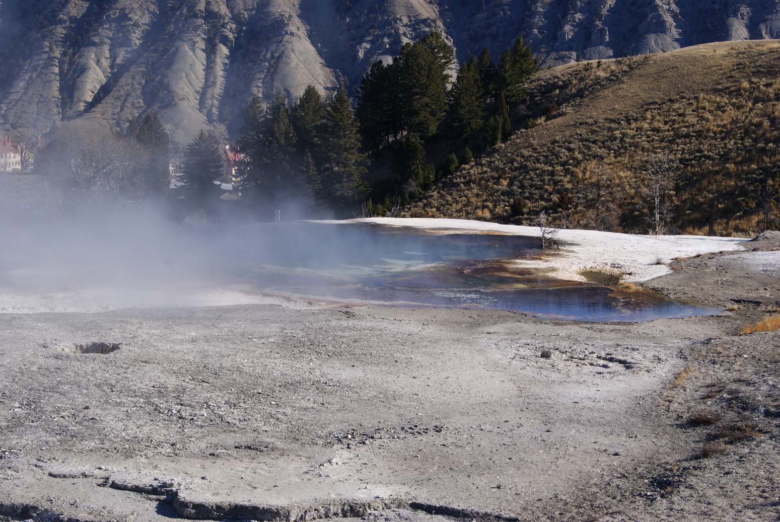 Nous commençons par le secteur Mammoth Country: Cette fascinante zone thermale est autant le domaines des wapitis (croisés sur la photo au dessus), que la région des nombreuses sources thermales calcaires formées en terrasses.