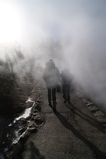 Nous sommes constamment noyés dans des volutes de vapeur qui nous réchauffent un peu le museau, ce qui n'est pas désagréable malgré l'odeur de souffre à laquelle nous nous habituons rapidement. De la vapeur, il y en a beaucoup, en toute logique puisque plus il fait froid plus la différence est grande avec ces eaux bouillonnantes!