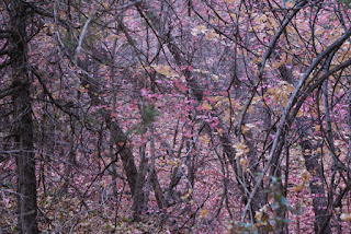 Le sentier serpente à flanc de falaise entre les arbres aux feuilles multicolores. L'automne est encore là dans le fond du canyon.