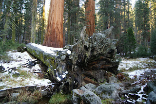 Nous arrivons à Sequoia National parc et il faut emprunter une longue route de montagne sinueuse pour arriver dans la Sequoia Giant Forest et trouver à côté des frêles arbrisseaux (à savoir nos arbres communs), les plus gros arbres de la planète. Le Général Sherman Tree (que nous sommes allés voir à la nuit tombante), âgé d'environ 3000 ans est le plus volumineux du monde, avec des 90m de haut, 11m de diamètre, 31m de circonférence et une écorce épaisse de plus de un mètre. Inutile de vous préciser qu'il est vain d'essayer d'accrocher une balançoire à sa première branche, celle-ci est à 40m au dessus du sol!