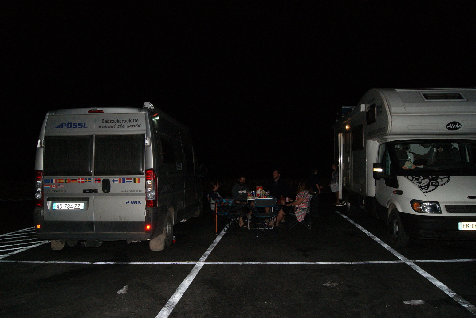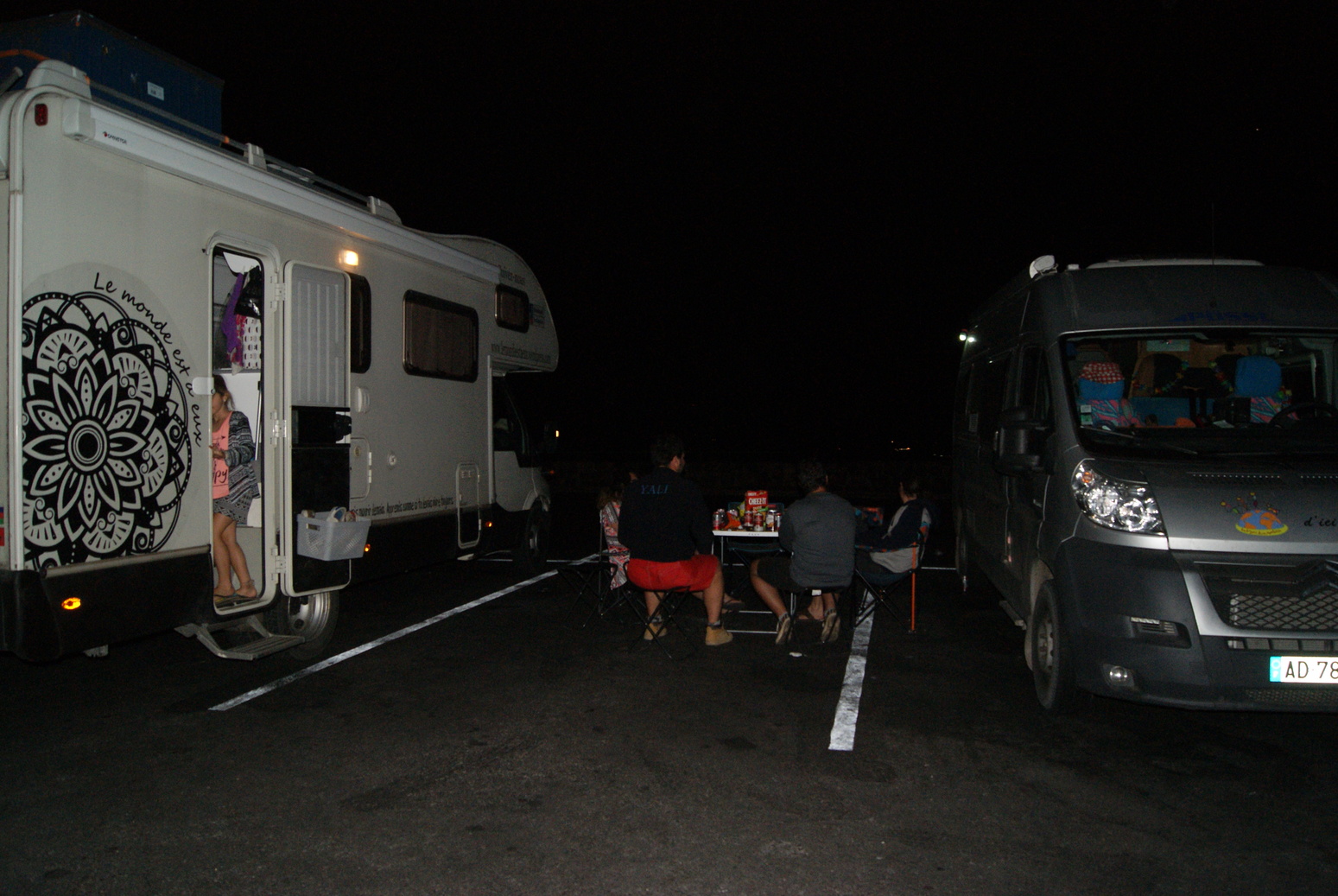Et c'est avec grand plaisir que nous retrouvons ces bivouacs ou nous nous installons, ou nous oublions de manger en nous racontant tout ce que nous avons vu depuis la séparation, ou les enfants jouent sans plus se soucier de nous, ou nous restons jusqu'à pas d'heure à papoter (22h! La nuit tombe tellement vite que nous vivons avec les heures de clarté, tôt le matin et tôt le soir. Et tout le monde était claqué avant l'heure du crime!). Nous avons une nouvelle fois passé une superbe soirée tous ensemble en faisant la connaissance de Florent, un ami de Pauline et Lionel qui voyage avec eux depuis quelques jours dans Aloha leur camping-car avant de trouver son van de location le lendemain.