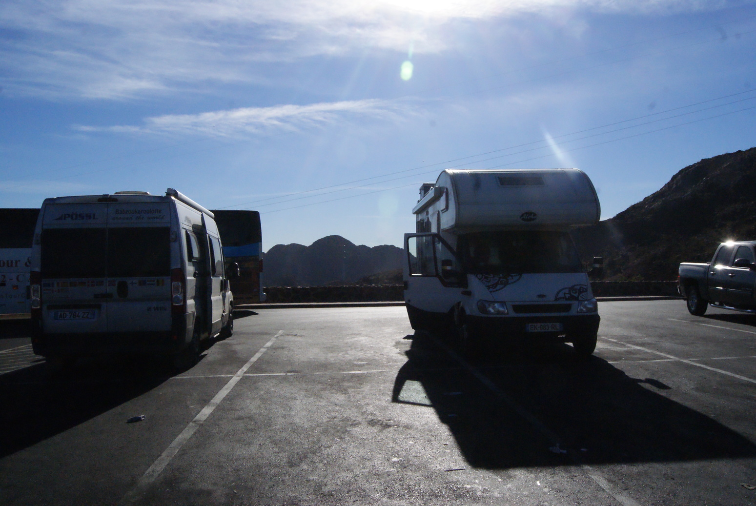 Le bout de la route, c'est à dire plus de 100km, il était déjà bien tard à la redescente pour aller où que ce soit d'autre dans la vallée et nous nous sommes repliés juste avant l'entrée du parc pour bivouaquer en lieu et place d'un ancien camping abandonné où seules restaient les dalles de béton des emplacements. Nous n'étions pas les seuls à bivouaquer dans le coin! C'était assez surréaliste.