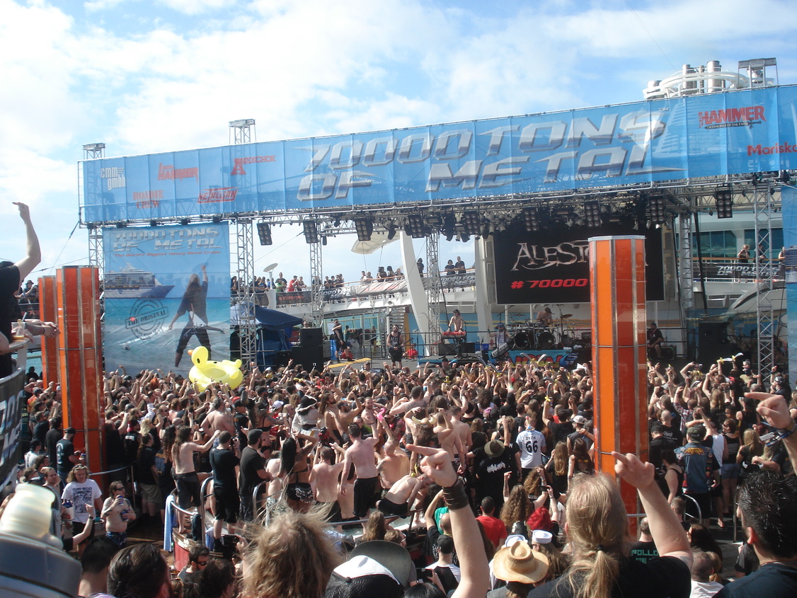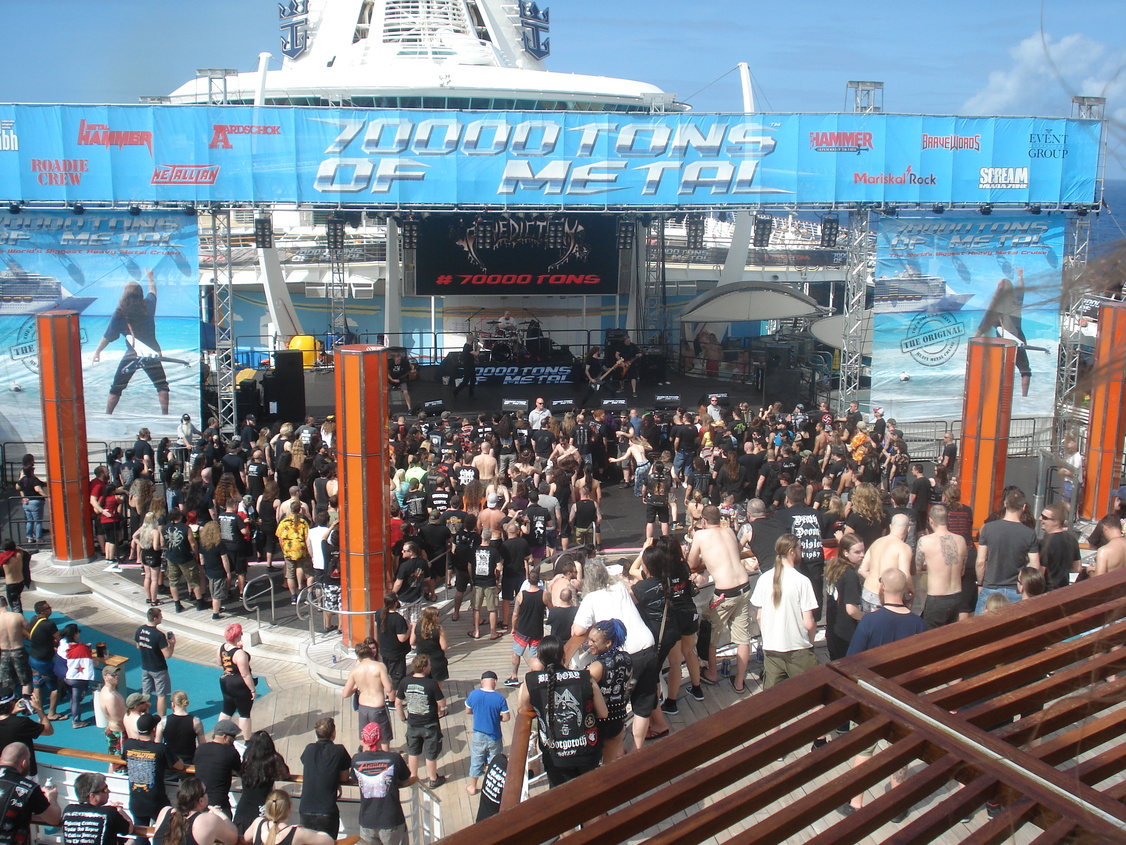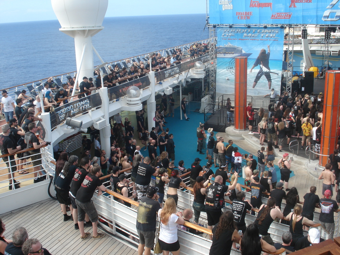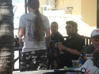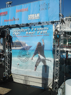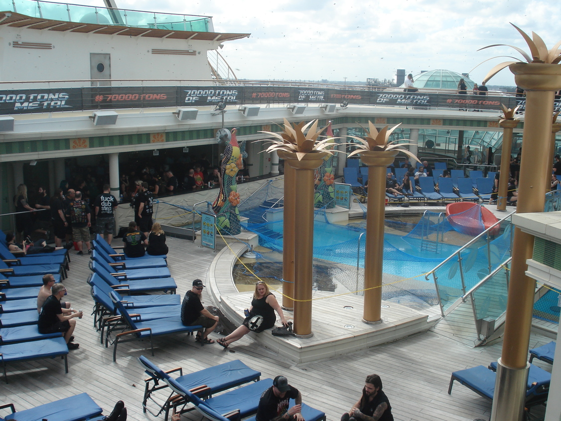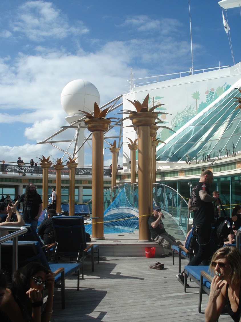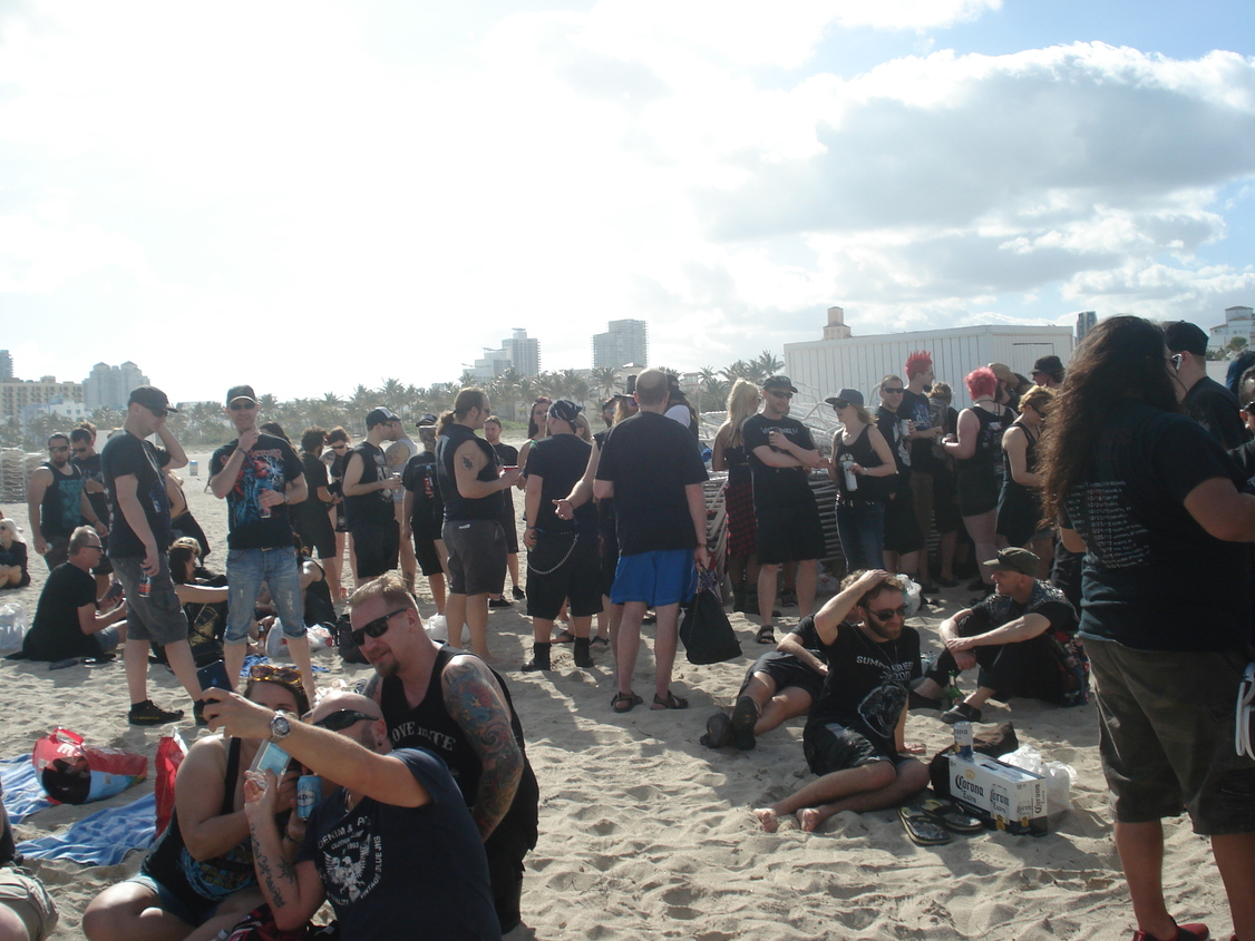 Un petit coup de grâce de la météo le lendemain nous permet d'appréhender sous le soleil l'avant croisière: la beach party va pouvoir battre son plein avec une grande partie des croisièristes qui sont déjà là! Nous retrouvons Samm, ma copine qui arrive avec Kana sa colocataire de cabine et faisons connaissance avec Hélène et Marc qui sont eux aussi là pour leur baptème des 70 000 tons of metal, et avec Fabienne et son mari qui arrivent de Suisse, mais qui n'en sont pas à leur coup d'essai eux. Nous nous retrouverons tous tout au long de la croisère jusqu'au dernier jour et c'est magnifique de pouvoir évoquer ensemble notre chance d'être là. Et quel bonheur pour moi, j'ai appris le matin même de l'un des français que j'ai retrouvé qu'un ami de 30 ans (pas revu depuis) serait de la fête avec nous! Et il n'aura pas fallu 1h pour que je retrouve Yves sur la plage, nous avions de quoi occuper la soirée de souvenirs! Soirée qui s'est poursuivie en bord de plage à l'hôtel Clevelander privatisé pour l'occasion (ils ne sont pas fous, ils pouvaient bien se priver de clients classiques vu les bénéfices qu'ils ont dû faire avec les centaines de métaleux qui ont investi leurs terrasses!).