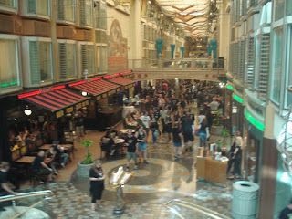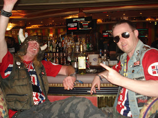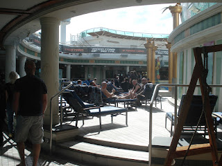 Ca y est, nous sommes à bord et nous découvrons (pour ceux pour qui c'est la première) quelques petites bribes de cet immense bateau, véritable ville flottante comme nous le voyons dans les reportages. Nous avons encore nos bagages avec nous, les cabines ne seront prêtes que dans une bonne heure. Les habitués savent d'emblée où se rendre pour patienter: au pub! Ce pub est stratégique sur le bateau, il est en plein milieu de l'allée centrale et c'est le meilleur moyen pour se retrouver d'où que nous venions sur le bateau.