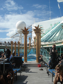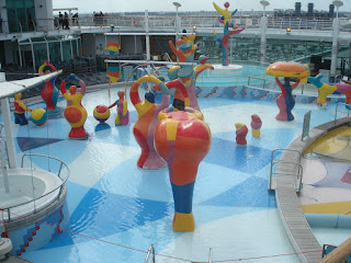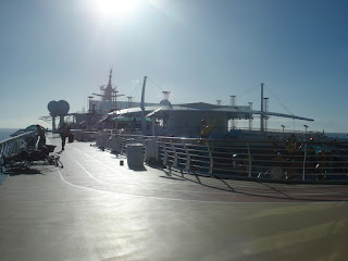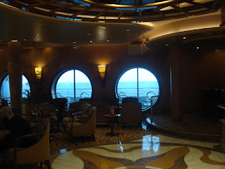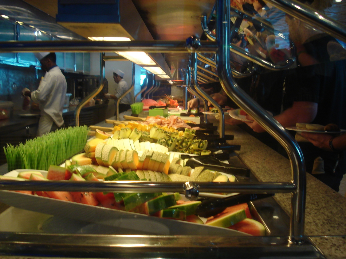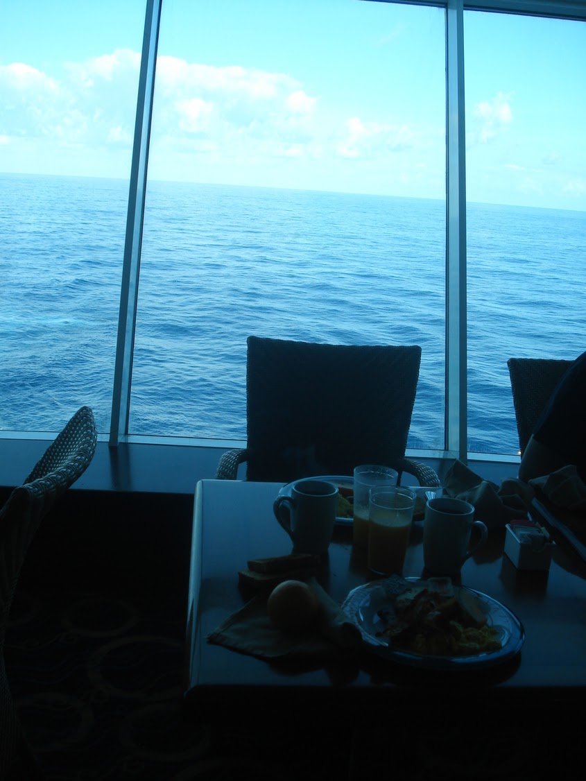 Je ne sais par quel miracle le lendemain matin au réveil je tombe sur Samm au détour d'un escalier alors que nos cabines sont non seulement sur des ponts différents mais en plus radicalement opposées sur le bateau. C'est l'appel du ventre qui nous a fait errer dans le même quartier à la recherche de l'immense self service (je n'ai jamais vu autant de choses différentes avec autant de buffets différents....c'était juste une hallucination que ce soit pour le petit-déjeuner, le déjeuner ou le dîner et pourtant ma société avait déja placé la barre haute). En mettant nos piètres connaissances du bateau en commun, nous avons fini par trouver, il nous fallait monter au pont 12 pour redescendre au 11 mais d'un seul côté du bateau! Simple comme bonjour......quand on est sur le bateau depuis 3 semaines....et ça ce n'est pas nous!