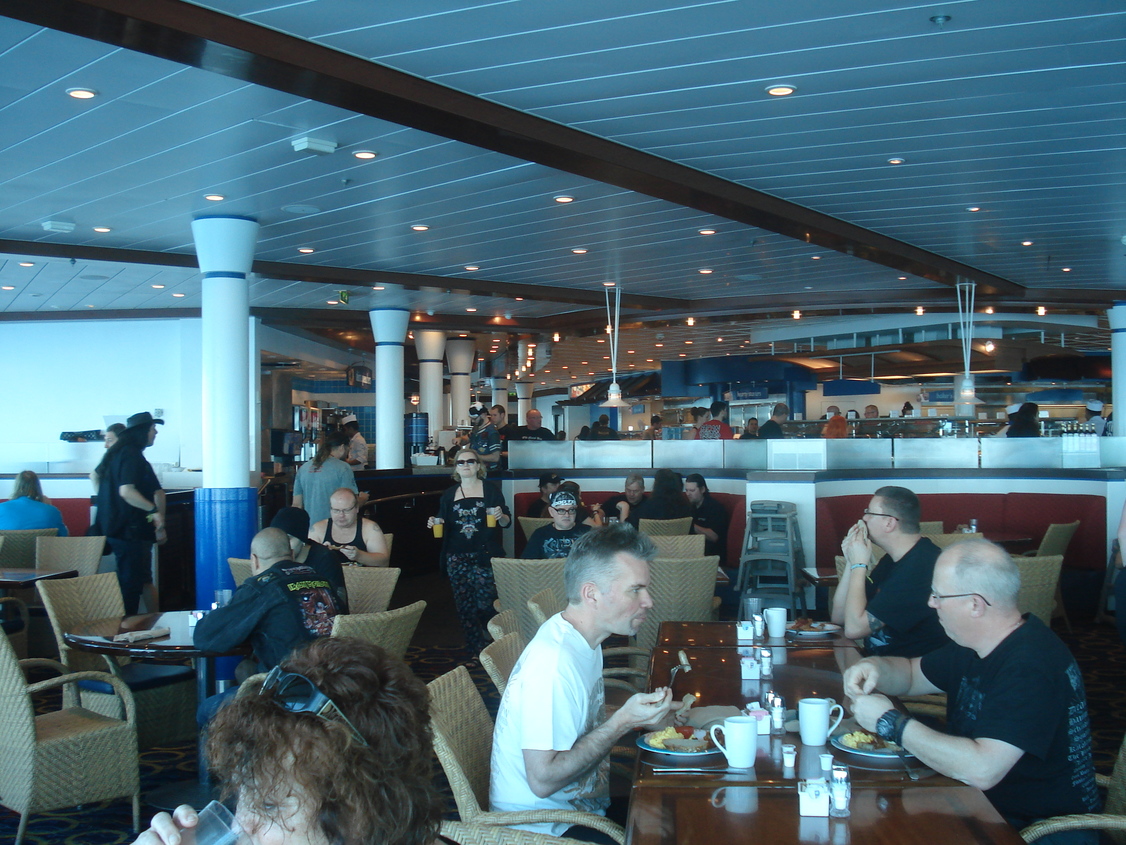 Nous sommes allés dîner pour ce premier soir avec le groupe de français dans le restaurant du pont 4. Imaginez un restaurant gastronomique avec tout le tsoin tsoin qui va avec, entre les maitres de tables, les serveurs aux aguets pour voir s'il ne manque rien, la famille entière de couverts dont on ignore qui sert à quoi, enfin bref la totale!. Et bien c'était exactement pareil mais qu'avec des métaleux pour clients. Les cartes en main, nous pouvions choisir ce que bon nous semblait, et nous étions servis comme des papes tout étant englobé dans le prix de la croisère. Et ce pour le plus grand plaisir du personnel du restaurant qui disait unanimement que cette croisière est la plus fantastique pour eux. Ils travaillent exactement de la même manière que pour une croisière classique, mais la différence se fait avec nous qui sommes beaucoup plus respecteux vis à vis d'eux que les croisièristes classiques. C'est souvent la même ritournelle, les clichés tombent comme les feuilles en automne dans beaucoup de domaines: ce qui semble être le pire pour le commun des mortels s'avère souvent être le meilleur et ça me fait plaisir de le préciser! C'était un pur bonheur pour nous de les avoir toujours à nos côtés pour régler les moindres détails si souci il y avait surtout que soucis il n'y a pas eu! D'ailleurs je suis remontée faire je ne sais quoi dans ma cabine le premier soir, et un membre de l'équipage était là dans le couloir, dès qu'il m'a vu m'approcher de ma porte, il est arrivé en m'appelant par mon prénom pour me dire qu'il est le responsable de mon secteur et il m'a donné une petite carte avec un numéro en me disant que je pouvais utiliser n'importe quel téléphone du bateau pour l'appeler en cas du moindre besoin. J'en suis restée ébahie!