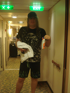 Je profite du début de soirée pour aller m'atabler au pub où il y a toujours quelqu'un que l'on connait pour papoter. Et ce coup-ci, personne! Ah ben zut! Tant pis, je m'atable toute seule et juste quelques minutes plus tard, un gars vient vers moi et me demande comment ça va. Un français déjà, c'est toujours ça de pris pour discuter! Il me demande s'il peut s'asseoir avec moi. Oui évidemment! Et nous voilà partis pour papoter de tout et de rien. Il me demande ce que je suis allée voir aujourd'hui et la veille, et je le lui dis. Et d'un coup le voilà qui dit "tiens y'a mon batteur qui passe". Euh son batteur.... Me voilà comme une fleur qui vient d'éclore "mais tu joues dans un groupe?" et lui "ben oui, tu m'a vu hier avec Yves, je suis le guitariste de Rhapsody"..... Et là le gros gloubiboulga du cerveau... je vous l'ai dit que je papotais avec Yves pendant le concert!!! Je m'excuse pour ma bourde qui est excusée ipso facto et nous partons en fou rire en imaginant des scénarios où j'aurais pu dire que j'avais vu Rhapsody la veille et que c'était complètement pourrave..... Bref, nous nous entendons comme larons en foire avec Dodo donc, maintenant que je le connais! Et du coup il m'invite à aller manger le soir même avec tout le groupe, d'autant que c'est son anniversaire. Le happy birthday est repris dans toutes les langues , c'est magique ce goupe avec autant de nationalités différentes et ces décennies de succès. Nous passons une excellente soirée rejoints ensuite par Yves et allons nous coucher pas très très tôt. Mais nous nous couchons, parce que certains sur le bateau peuvent compter leurs heures de sommeil sur les 5 jours! Tu parles, tout est ouvert 24/24 et quand il n'y a plus de groupes (tôt le matin), le karaoké prend le relais.....