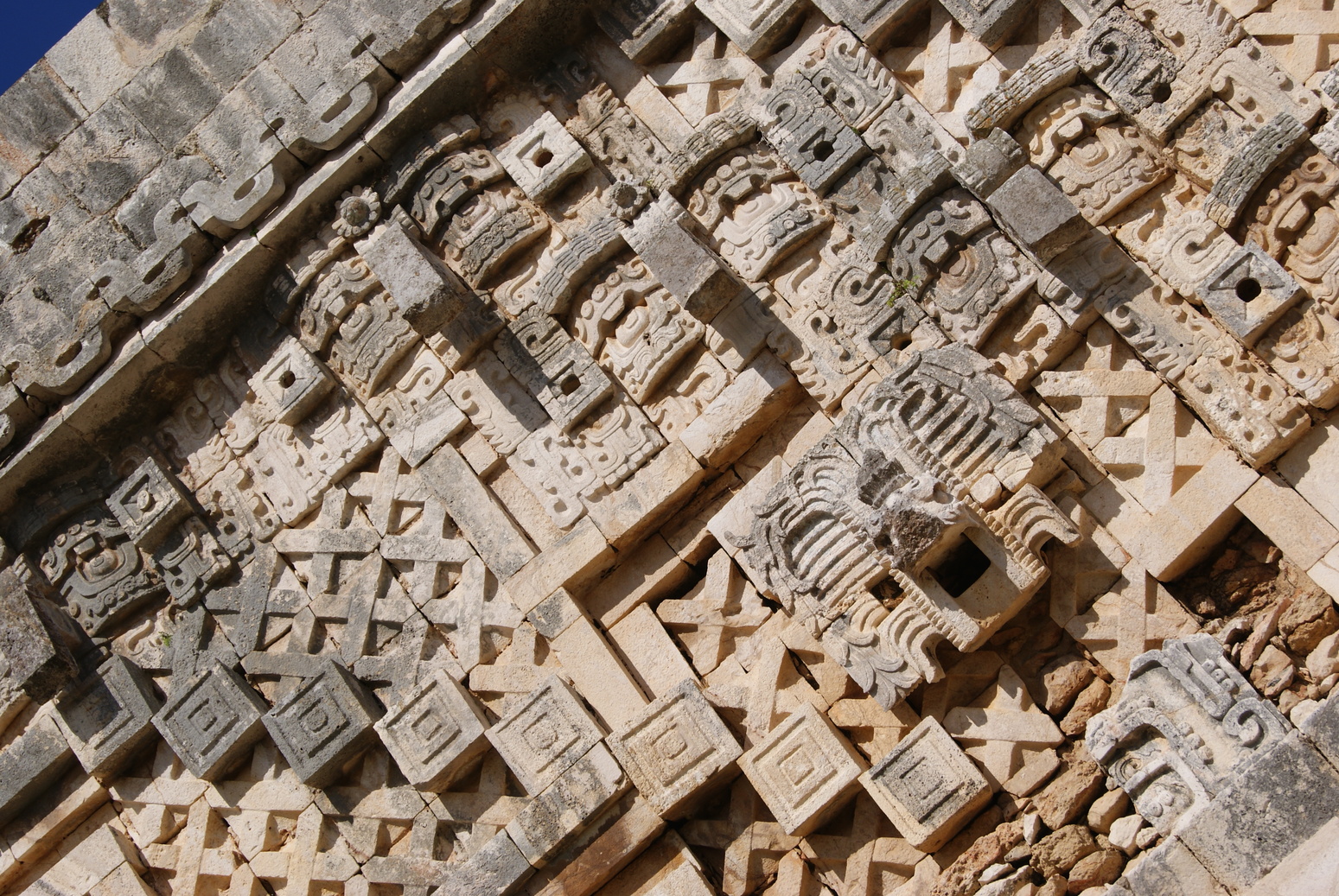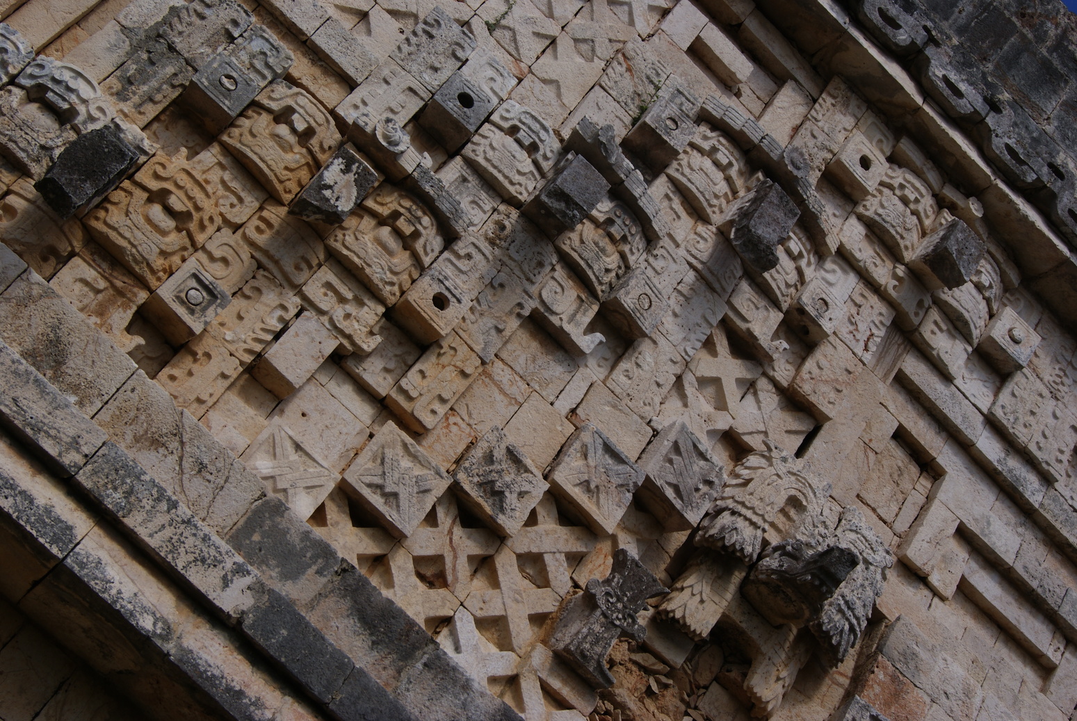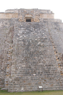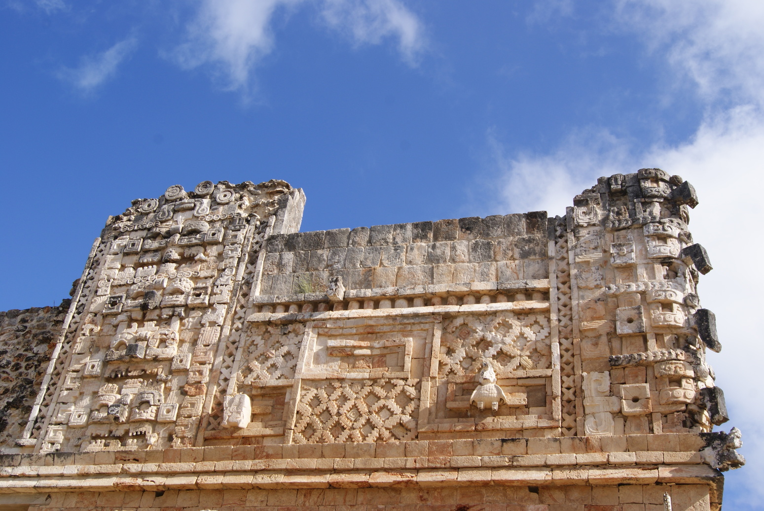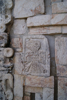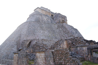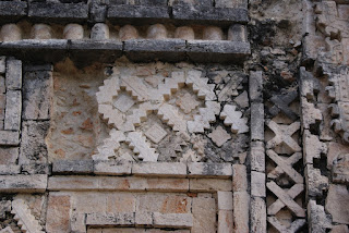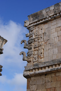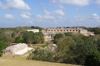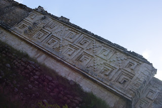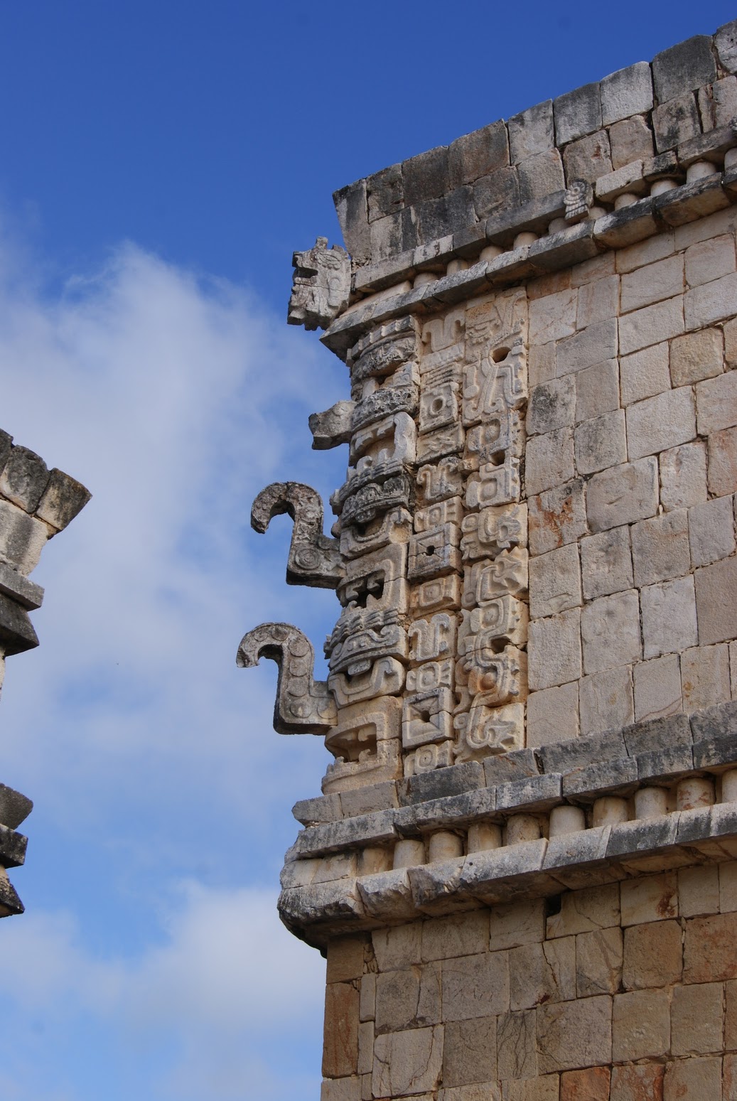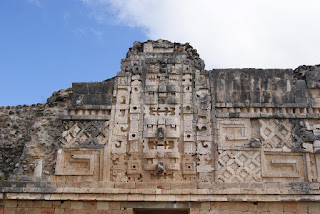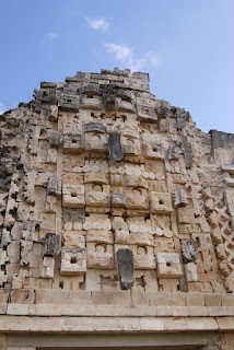 Arrivons-en à l'histoire de la cité Maya, un vaste ensemble qui compte parmi les plus impressionnants du pays avec ses structures en bon état et richement décorées. Uxmal était une cité importante, son nom signifie "construit trois fois", mais elle fut en réalité édifiée à cinq reprises. Le fait qu'une nombreuse population ait pu prospérer dans cette région si aride témoigne des talents et de l'ingéniosité des Mayas, qui construisirent plusieurs réservoirs et chultunes (citernes) tapissés d'une couche de chaux, afin de recueillir et de retenir l'eau pendant la saison sèche. En raison de la rareté de l'eau dans la région, Chac, le dieu de la pluie ou Serpent Céleste revêt une importance toute particulière. Il est omniprésent sur tout le site (on avait bien entendu la veille hein!), sous la forme de masques de stuc décorant les façades et les corniches.