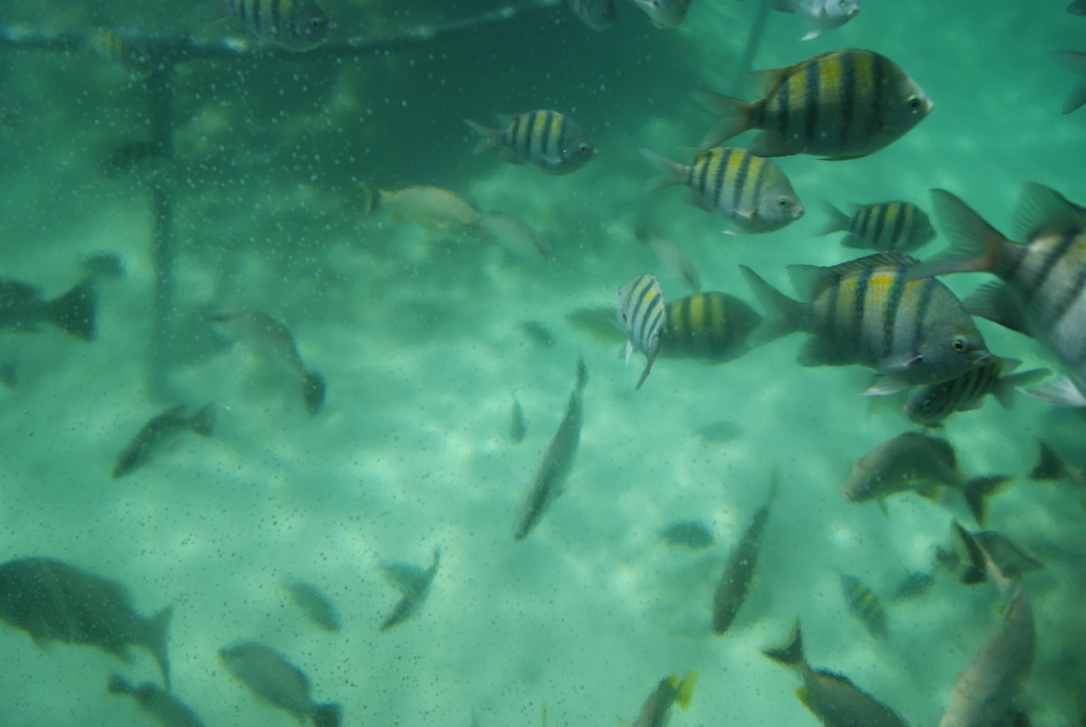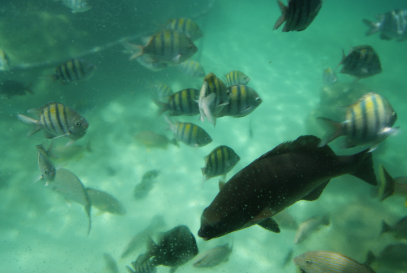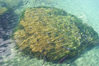 Une fois traversées les algues du bord de l'eau, me voilà en train de nager dans un aquarium géant. Les poissons sont magnifiques avec toutes ces couleurs et très nombreux malgré le monde. Le seul bémol est que ce monde brasse le sable du fond et que l'eau s'en retrouve un peu trouble. Vous allez nous dire que nous aurions pu trouver une autre plage moins bondée. Oui il y en avait, mais la barrière d'algues pour atteindre des eaux pour se baigner était infranchissable. Et cet inconvénient se reproduit toute le long de la côte. A chaque plage la baignade n'est possible que sur un tout petit périmètre. Quel dommage! Quel gâchis que rien ne soit mis en oeuvre pour leur nettoyage, ou alors c'est peine perdue, elles reviennent sitôt disparues?!?