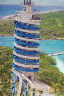 Le monumental toboggan à 4 pistes. Nous sommes à plus de 30m de hauteur quand il faut se laisser glisser dans les tourbillons!