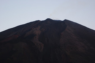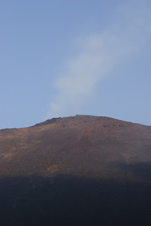Nous ressortons de là dessous quelques minutes plus tard et nous cherchons la baguette magique dans les mains du guide, le volcan avec ses fumerolles se dresse devant nous, plus trace du brouillard....il est maintenant en dessous de nous! Il était sûr de lui, il connaît l'endroit comme sa poche!