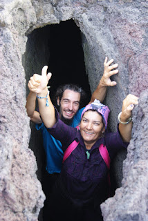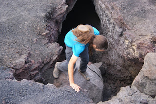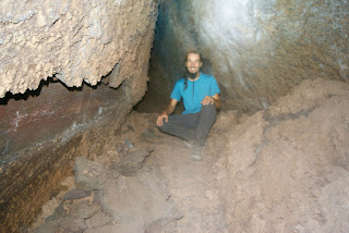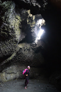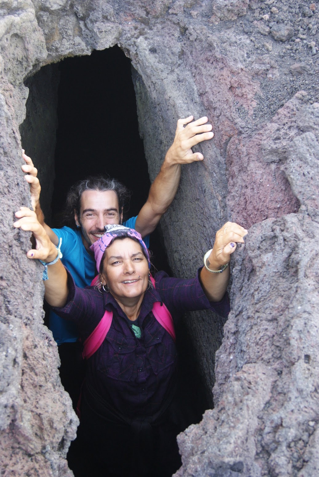 Après une vingtaine de minutes de marche il nous montre quelque chose d'extraordinaire, une première grotte au milieu de la coulée formée selon lui par une énorme bulle autour de laquelle la lave s'est solidifiée.
