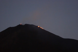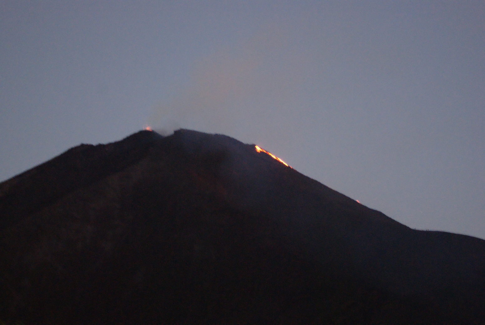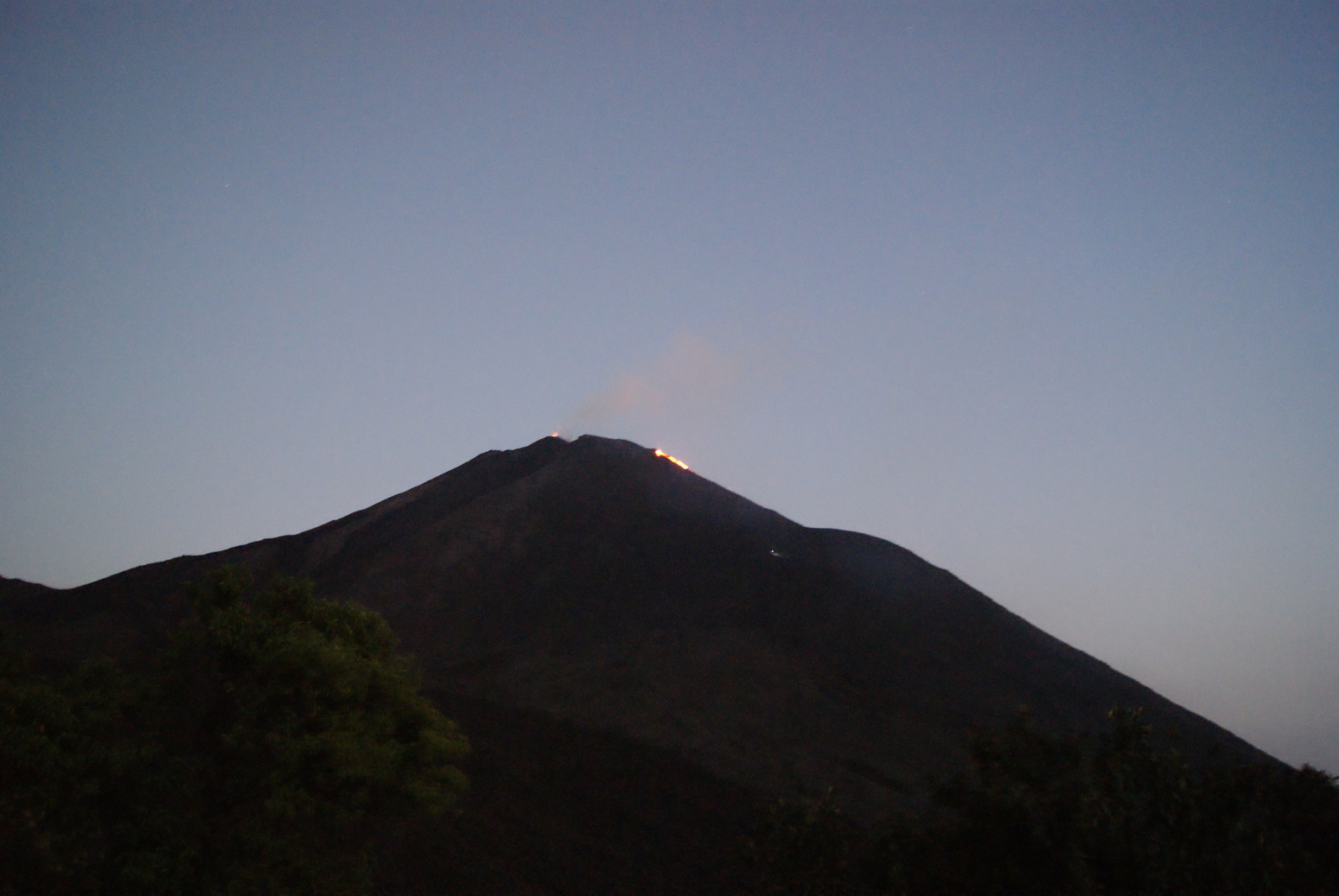 Les photos évidemment ne rendent rien, nous ne sommes absolument pas équipés pour ce genre de clichés, mais depuis quelques minutes les éruptions et jets de lave se succèdent sous nos yeux ébahis. La terre gronde et le spectacle est pour nous ce soir! Croyez-nous sur parole!