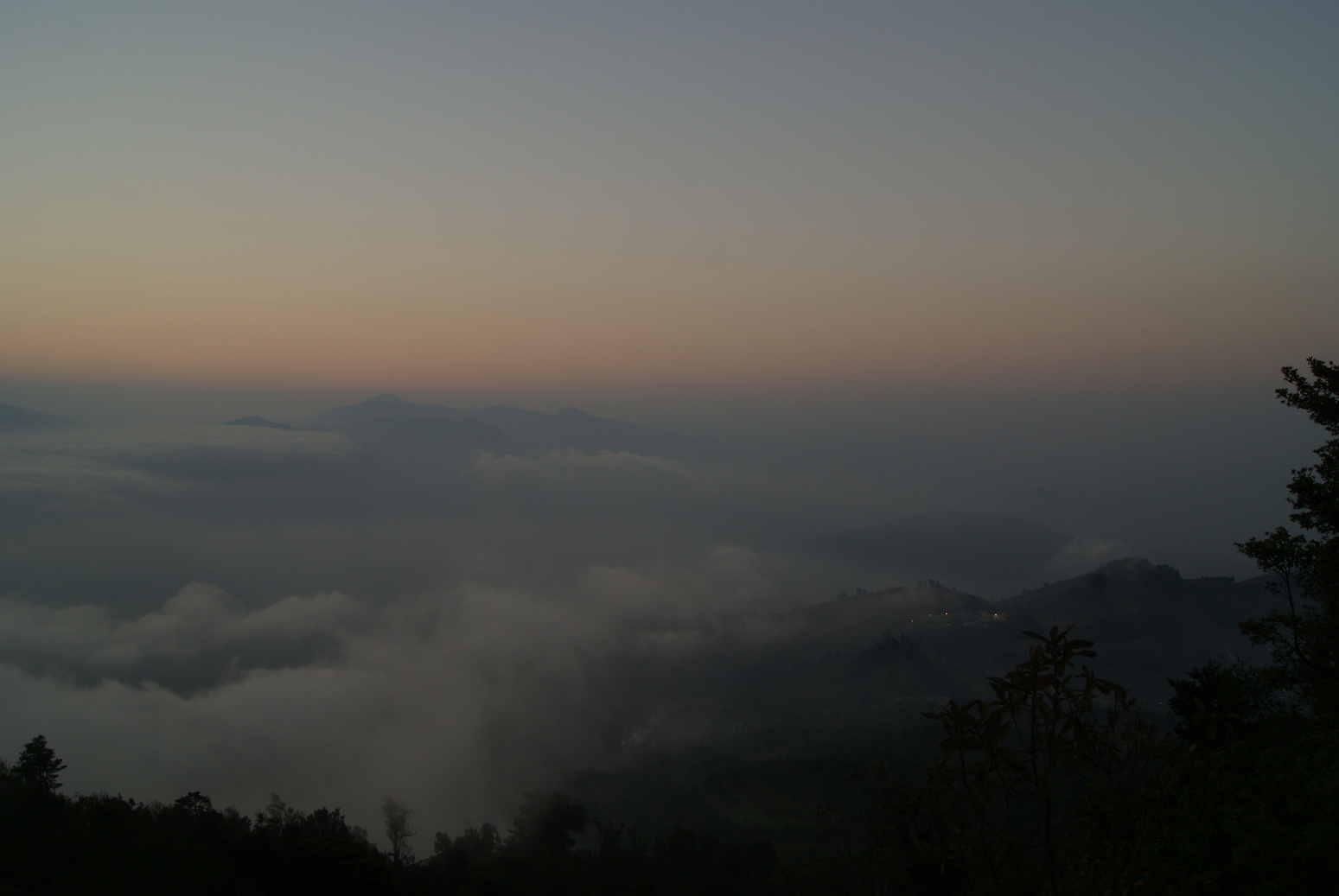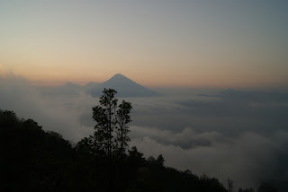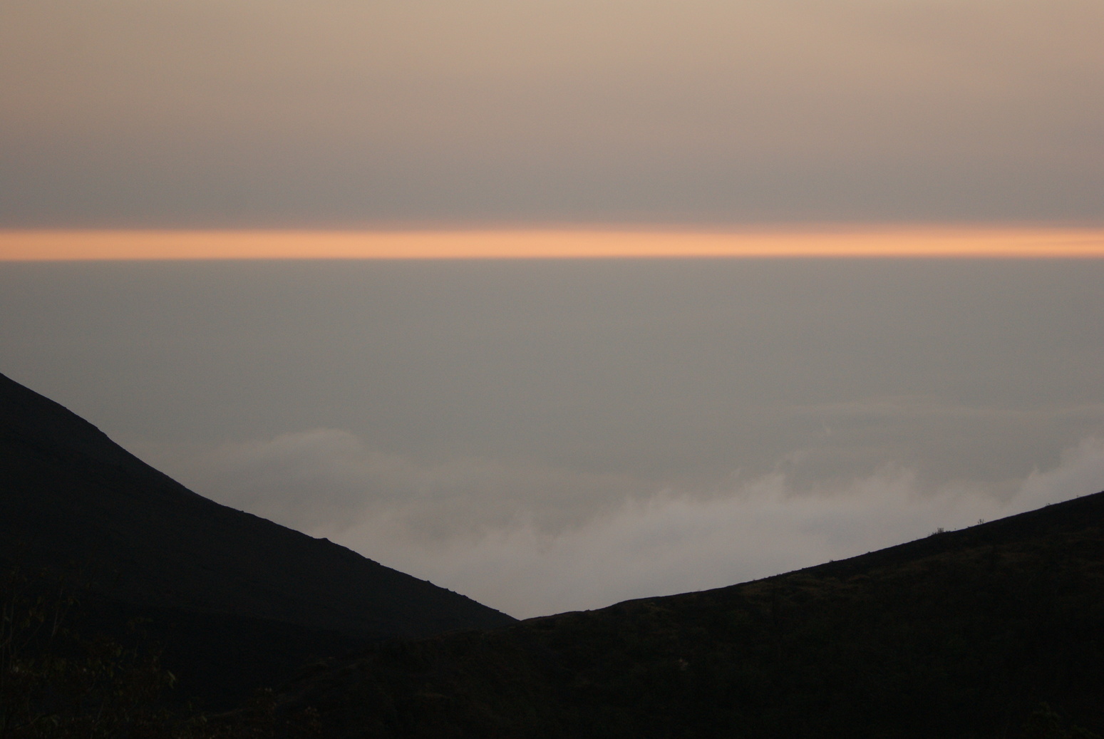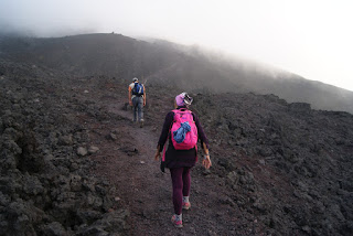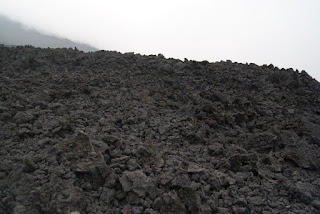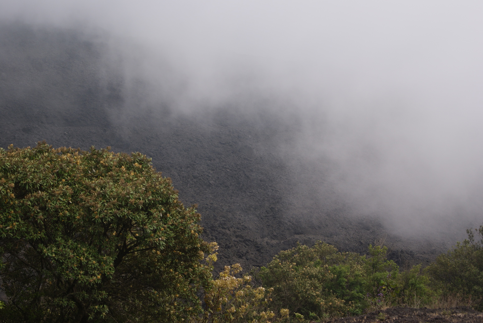 Il est maintenant 16h, l'heure d'aller se frotter à l'inconnu, nous ne voyons pas le volcan d'ici, il faut auparavant passer une première belle colline avant de pouvoir l'apercevoir. Et de toutes façon, même sans la colline nous n'aurions rien vu, un épais brouillard a englouti tous les alentours. Nous demandons à Manolo si ce n'est pas inutile de monter dans cette purée de pois, il est sûr de lui: oui nous pouvons y aller! Alors soit, allons-y!