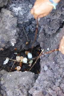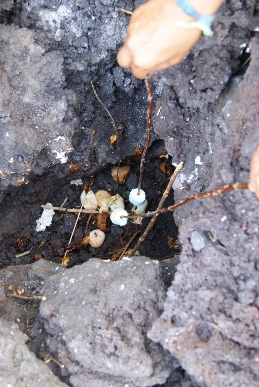 Manolo nous emmène dans le cratère d'un autre volcan, plus ancien mais dans lequel s'est écoulée la lave en 2014 et aussi incroyable que cela puisse paraître, la chaleur est toujours intense quelques centimètres en dessous de nos pieds. Et pour preuve, Manolo avait emporté avec lui des chamallows que nous faisons fondre à la chaleur de la terre en mettant juste le bâton dans les trous. C'est la cerise sur le gâteau que proposent tous les guides. Personne n'aurait l'idée de venir tout seul dans la caldéra de l'ancien volcan pour se rendre compte que tout bouillonne juste sous nos pieds.